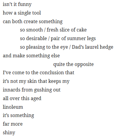 Laura Owens writes from a small apartment in Oxford, UK, and animates characters in videogames for a living. Recent pubs include perhappened mag, Versification, Detritus, and ang(st) zine’s Distanced project. Say hi on Twitter/Instagram @laurabethowens.