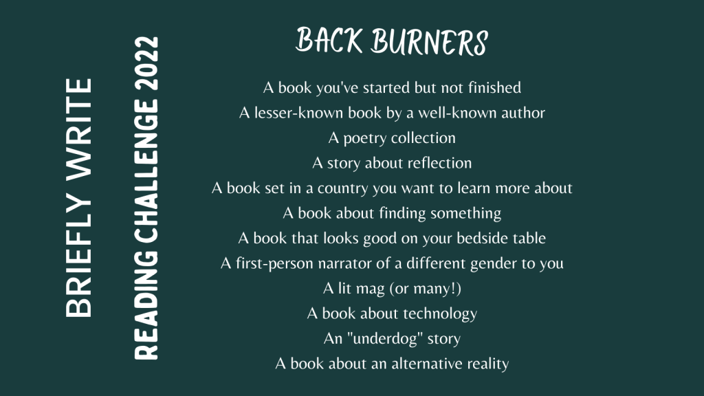 The first challenge is for BACK BURNERS, books you’ve had on your TBR pile (or a physical pile on your bookshelf / desk / wardrobe / garden shed) for years and never got round to starting (or finishing).