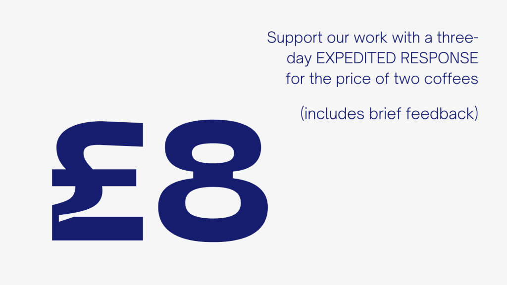 To cover our costs (website and ads removal; we don’t pay ourselves anything), we invite small donations on our Ko-fi page. We also offer an expedited response with brief feedback for £8 (see below).