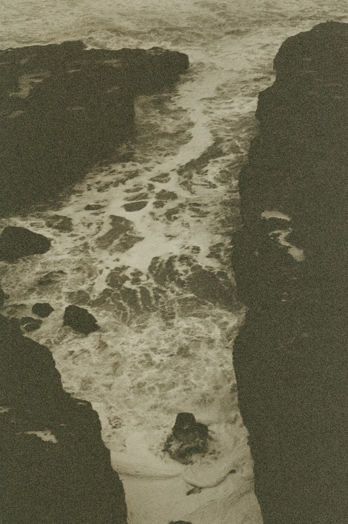 These photos were taken on the Oregon coast near sunset as a storm was beginning to blow mist in from the ocean, which, combined with the expired film, resulted in a pleasant, almost silkscreen-like effect in the form of large, prominent grain. The title is inspired by a man who was praying aloud at the water’s edge for hours (pictured in “Acolyte #1”). He and I were the only two on the bluffs that day, and the solitude and his spirituality, coupled with the incoming gray storm, lent a powerful yet peaceful aura to the area, which reminded me of being in a cemetery – but for something much larger than us.