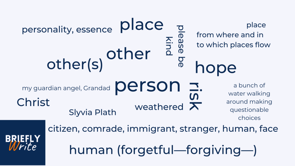 A poem is space, alliteration, what happens after. It is a portable word game and patience and lines on a page. A person is place and essence and hope and risk. Personality, forgetful… forgiving: a bunch of water walking around making questionable choices.